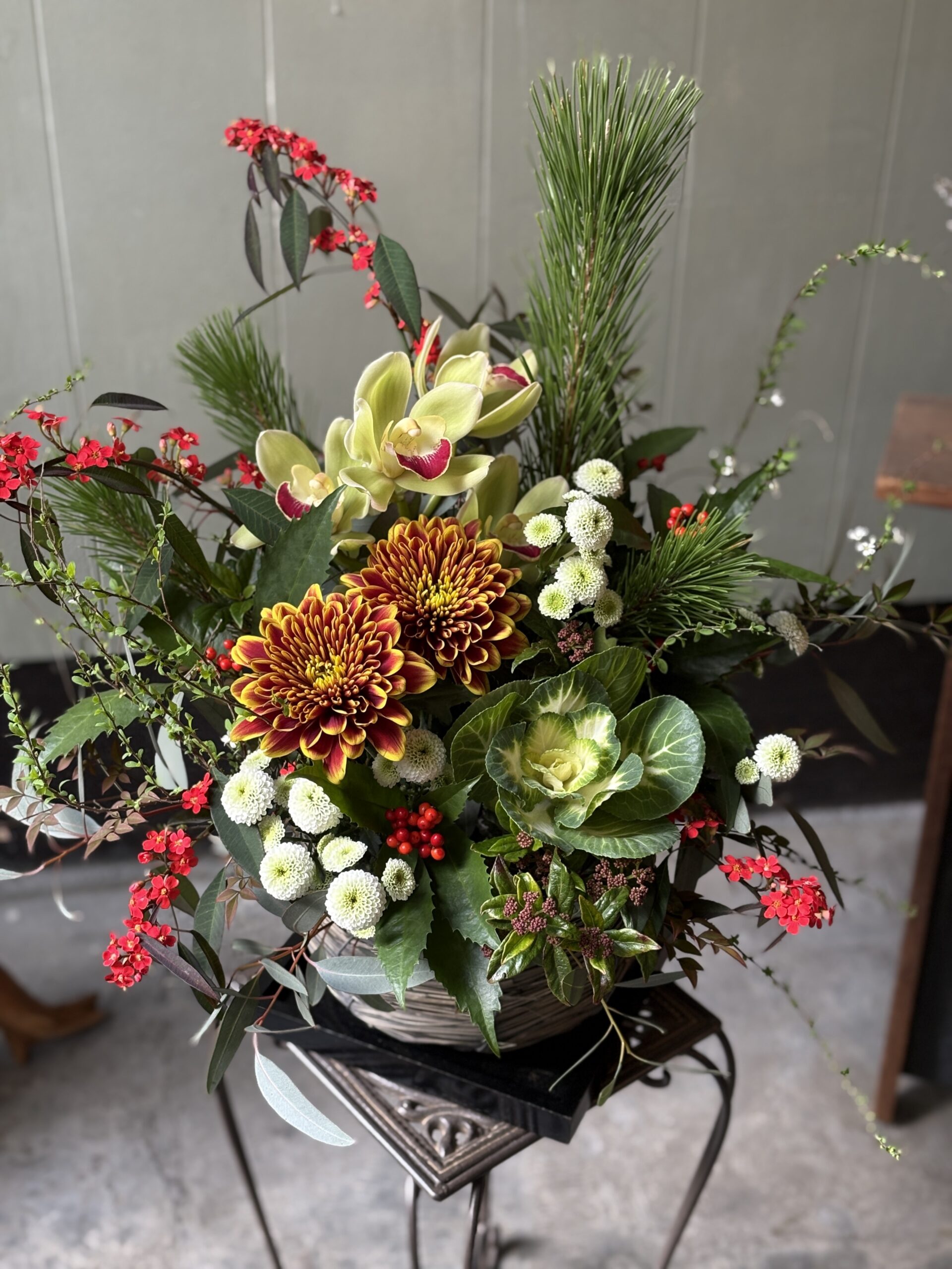 松や千両などのお正月花とその時入荷するお花を合わせて